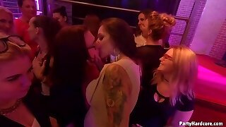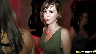 Bitchy girls are partying in the night pub, getting drunk and having gang sex adventures