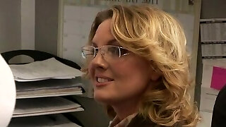 Sandy-haired glasses wearing nerd got lucky as she fucks with a fake tits milf